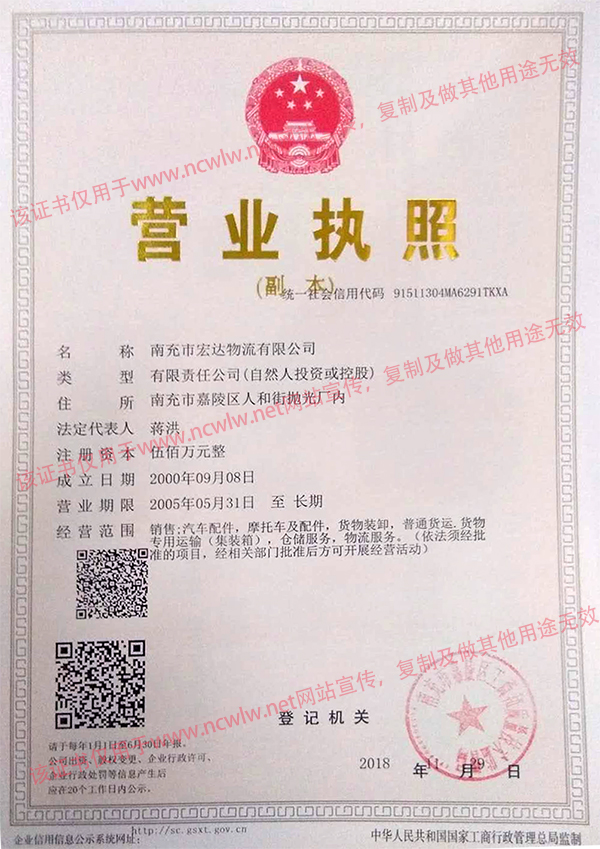南充物流網(wǎng)(m.kmwrj.com) 南充市宏達物流有限公司營業(yè)執(zhí)照