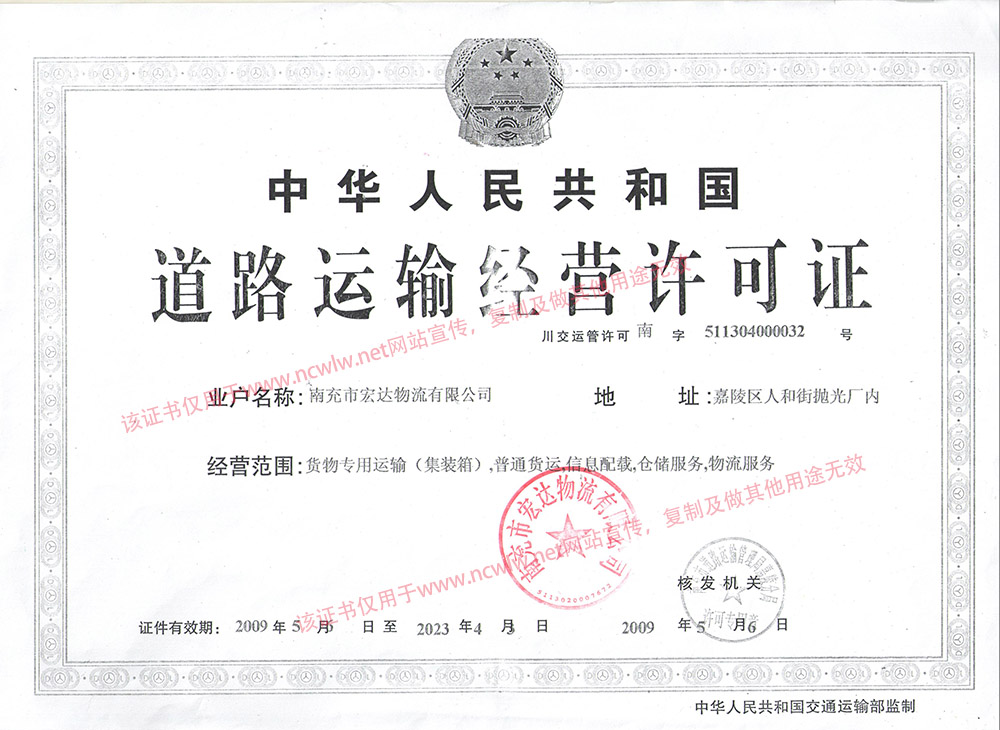 南充物流網(wǎng)(m.kmwrj.com) 南充市宏達物流有限公司道路運輸經(jīng)營許可證